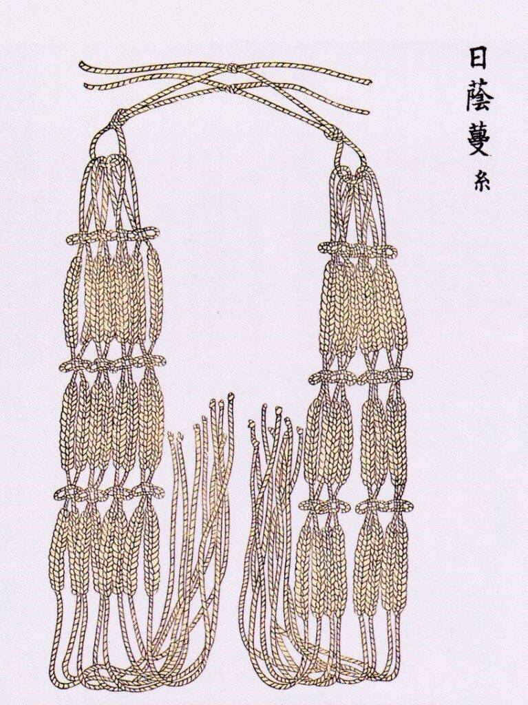 新嘗祭は毎年の新穀を神に捧げ、天皇自らも神々と共に食する行事です。その翌日には天皇出御のもと豊明節会と呼ばれる宴会が開かれ、舞姫による五節舞が盛大に披露されました。舞姫達は日蔭の蔓という髪飾りをつけて登場します。古代朝廷の祭事など儀式に奉仕する人々は冠の笄に蔓を頭部の装飾に用いました。植物の蔓は後に紐で「あげまき結び」と「にな結び」を連ねたものが使われるようになりこの結びを「日蔭蔓白糸結び」といいます。